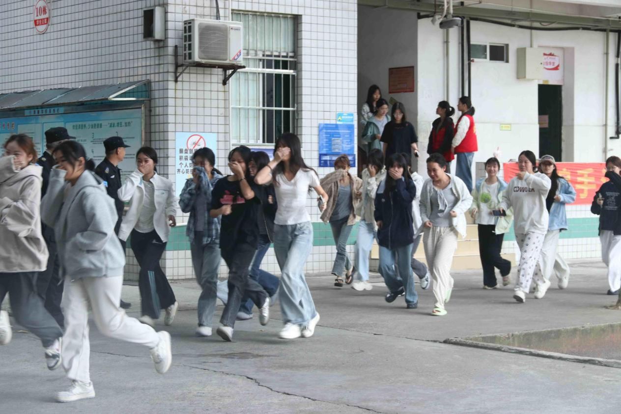 随着校园广播系统发布紧急疏散的指令,一场紧张而又井然有序的疏散演练正式开启。现场老师迅速到位,耐心指引方向,叮嘱逃生要点,同学们严格遵循低姿态弯腰前行的规范,用浸湿的毛巾紧紧捂住口鼻隔绝烟雾,沿着事先规划好的疏散路线,沉着冷静地加快脚步,不推不挤、不慌不乱,最终迅速且有序地撤离到了指定的安全区域。