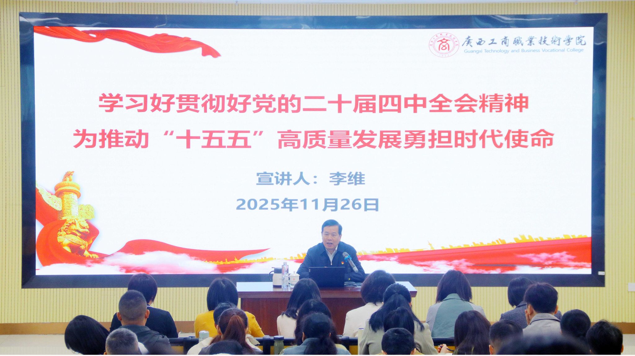 为深入学习贯彻党的二十届四中全会精神,准确把握党中央对“十五五”时期发展的战略部署,统一思想、凝聚共识,2025年11月26日,学校党委书记李维在武鸣校区为师生宣讲党的二十届四中全会精神。党委组织部(学院...